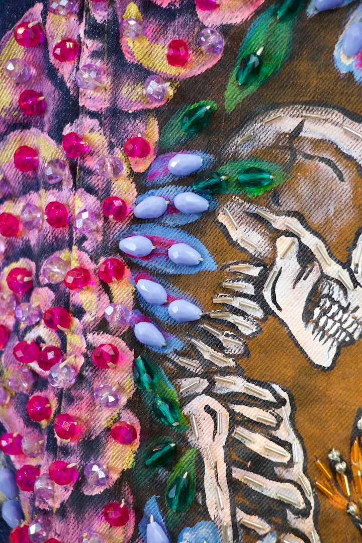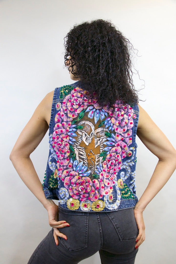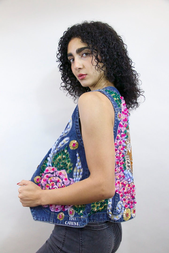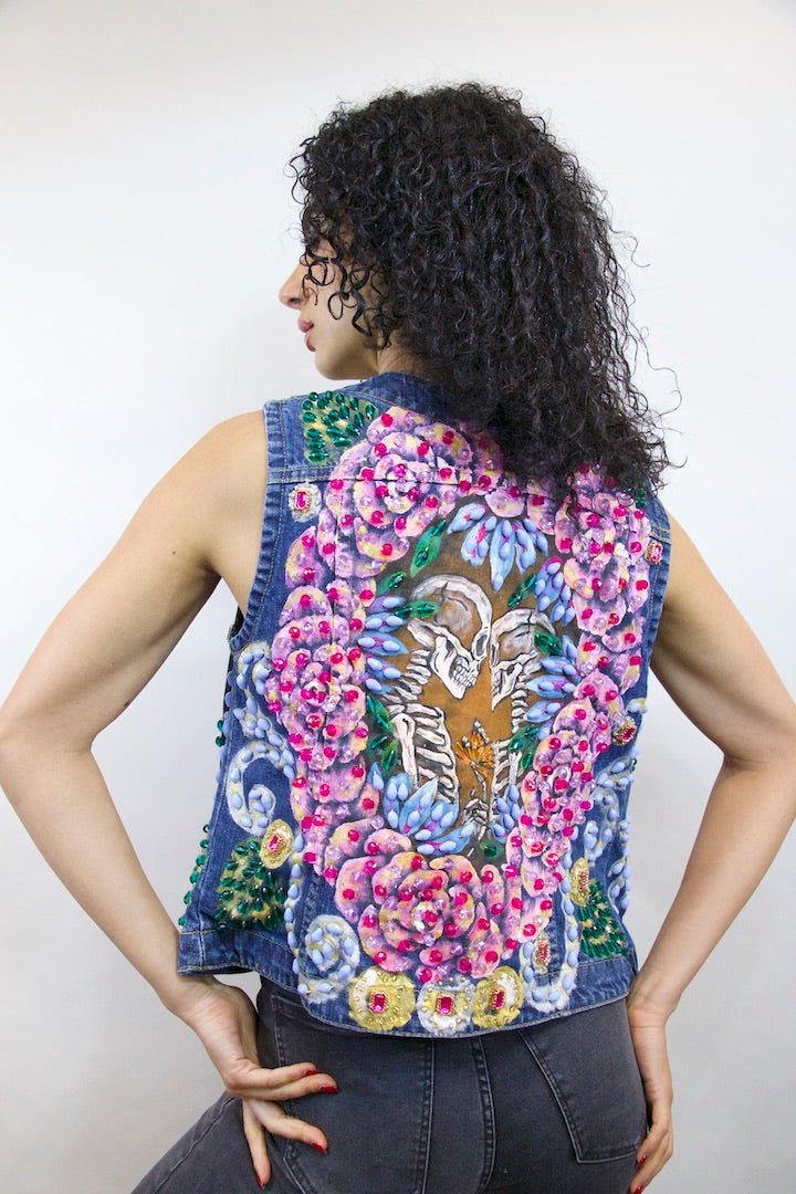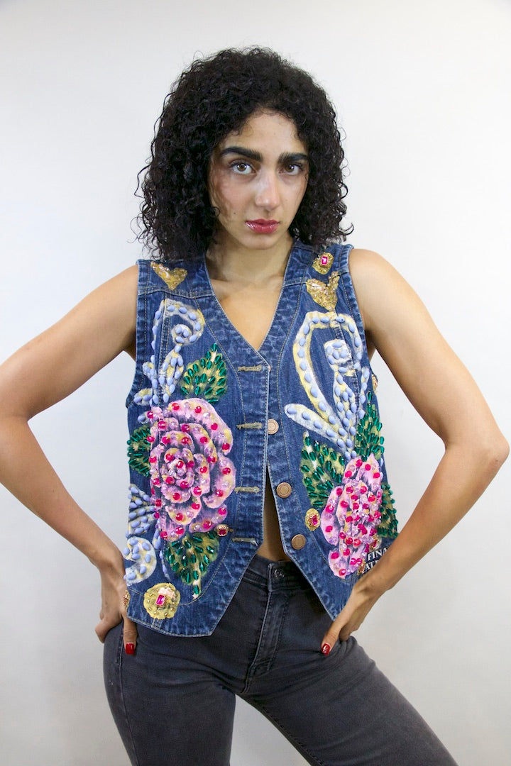CHALECO PINTADO Y BORDADO A MANO CON CRISTALES.