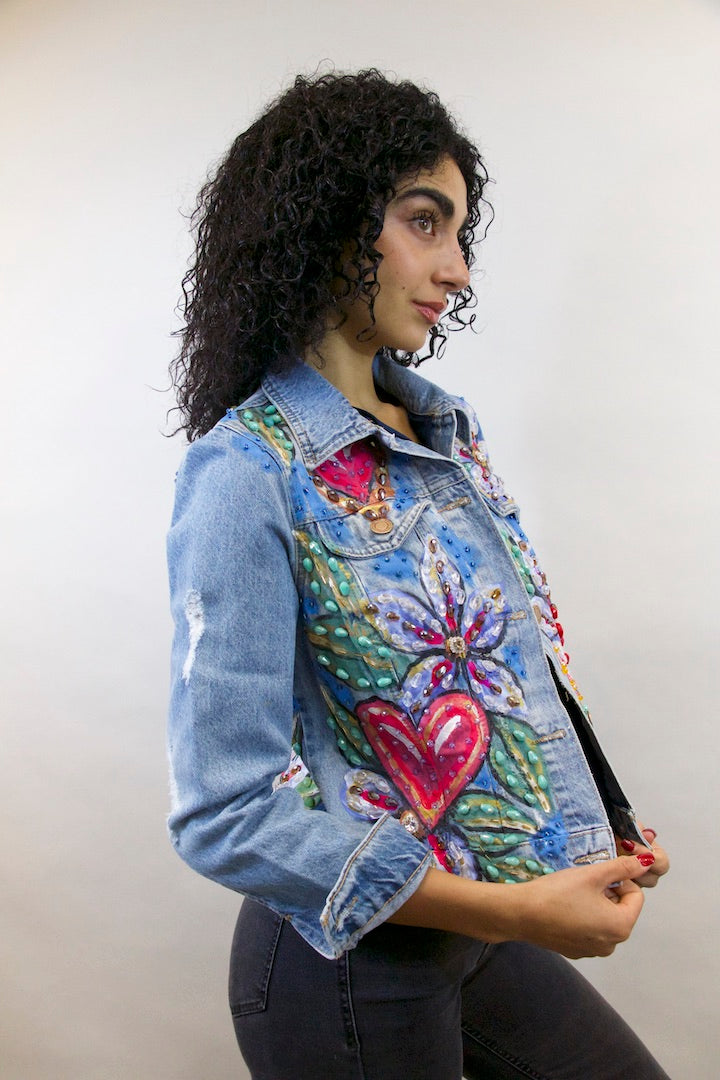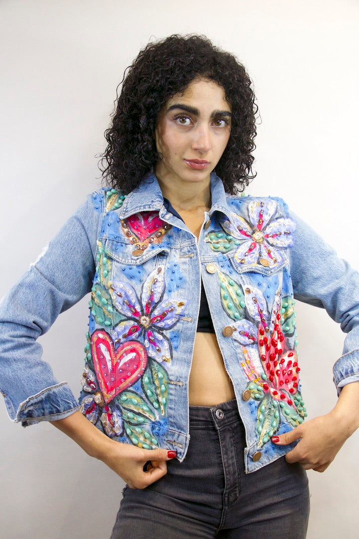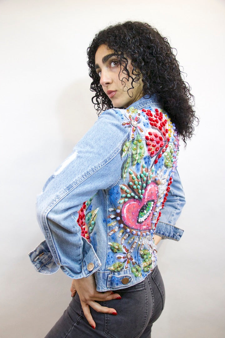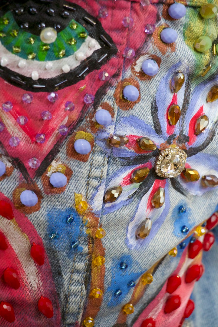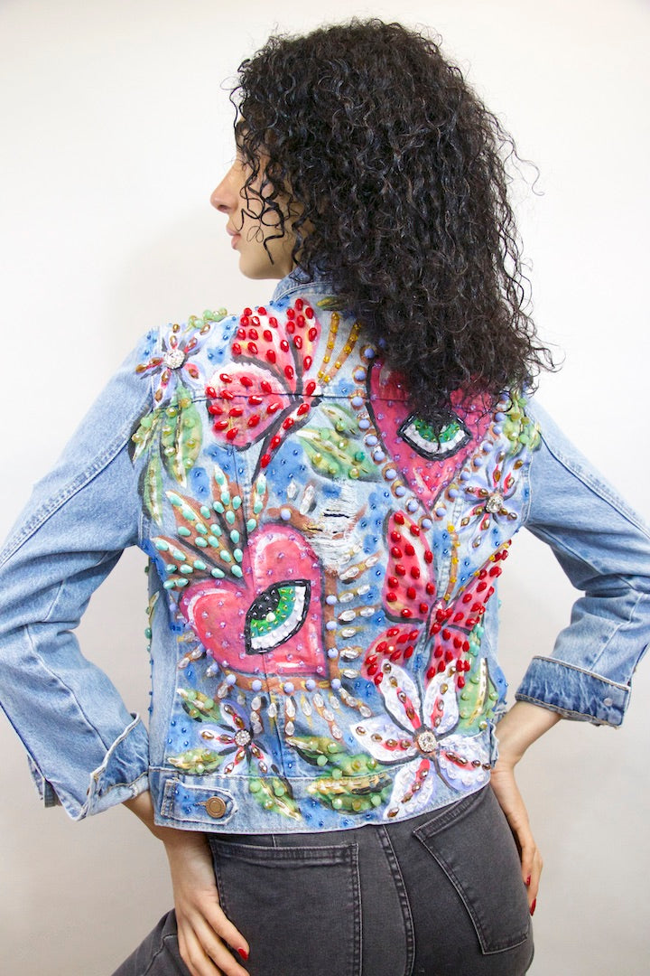 CHAMARRA PINTADA Y BORDADA A MANO CON PUROS CRISTALES.