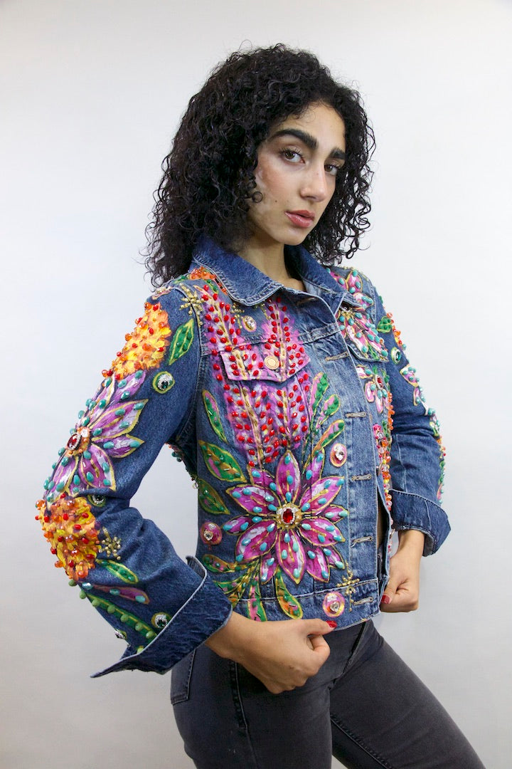 CHAMARRA PINTADA Y BORDADA A MANO CON PUROS CRISTALES.