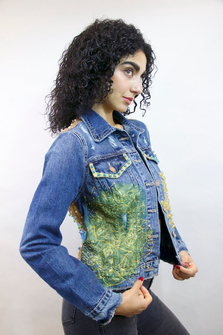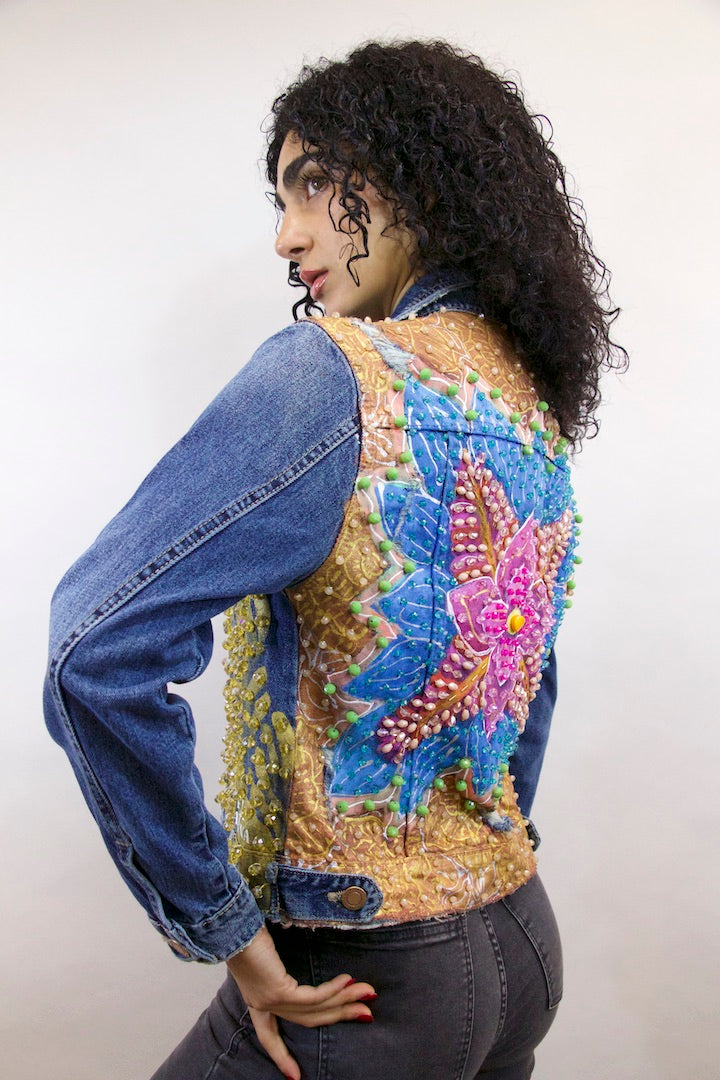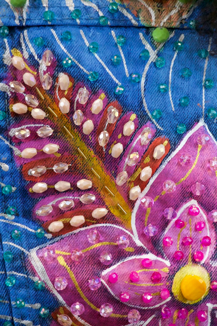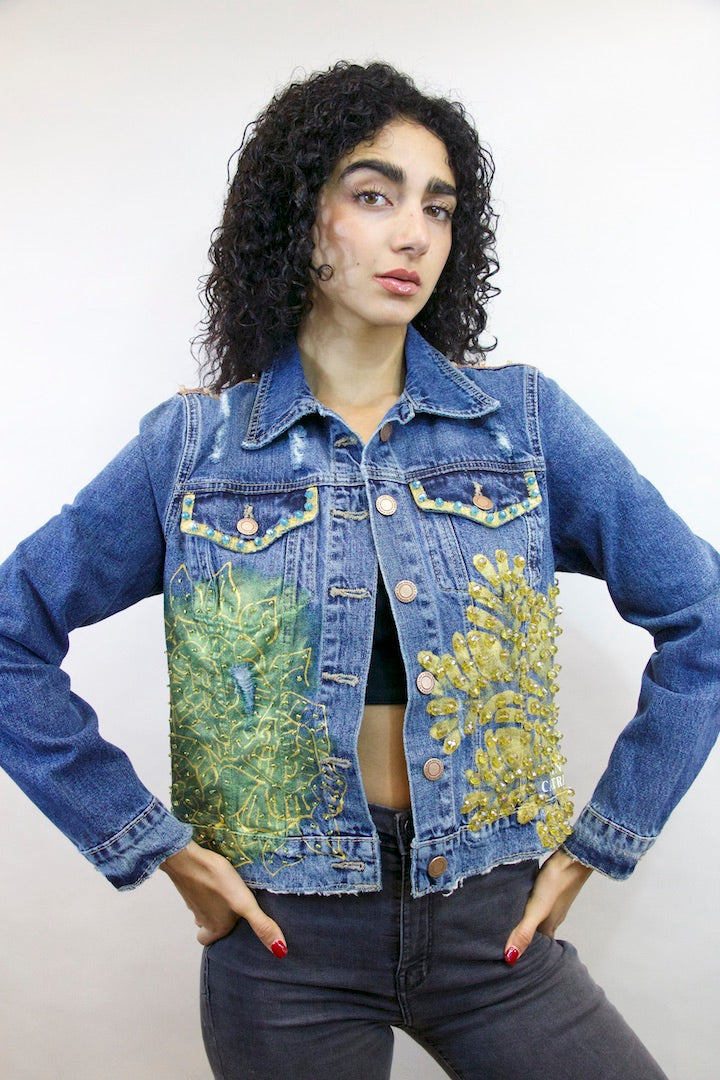 CHAMARRA PINTADA Y BORDADA A MANO CON PUROS CRISTALES.