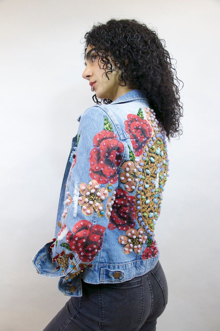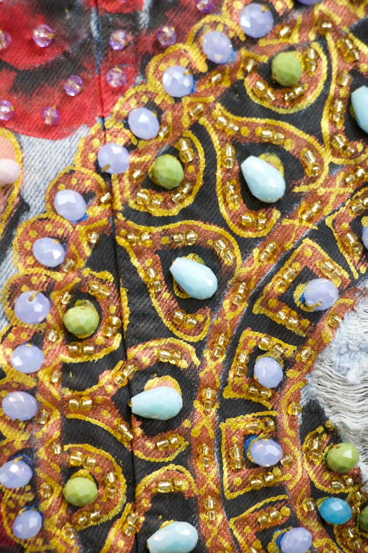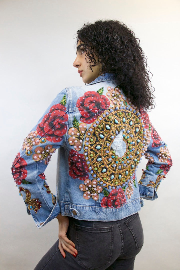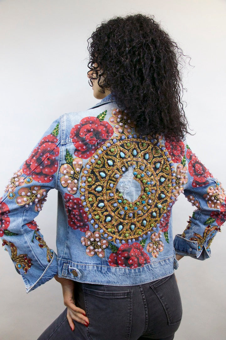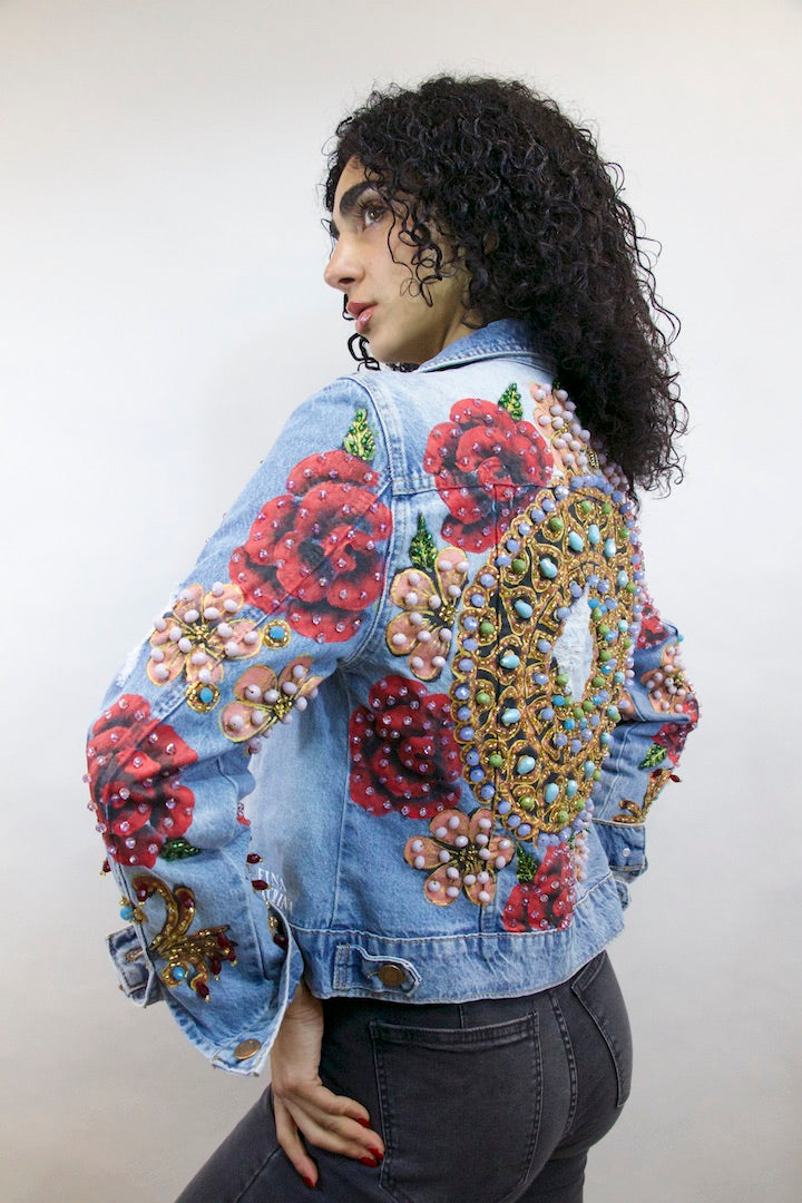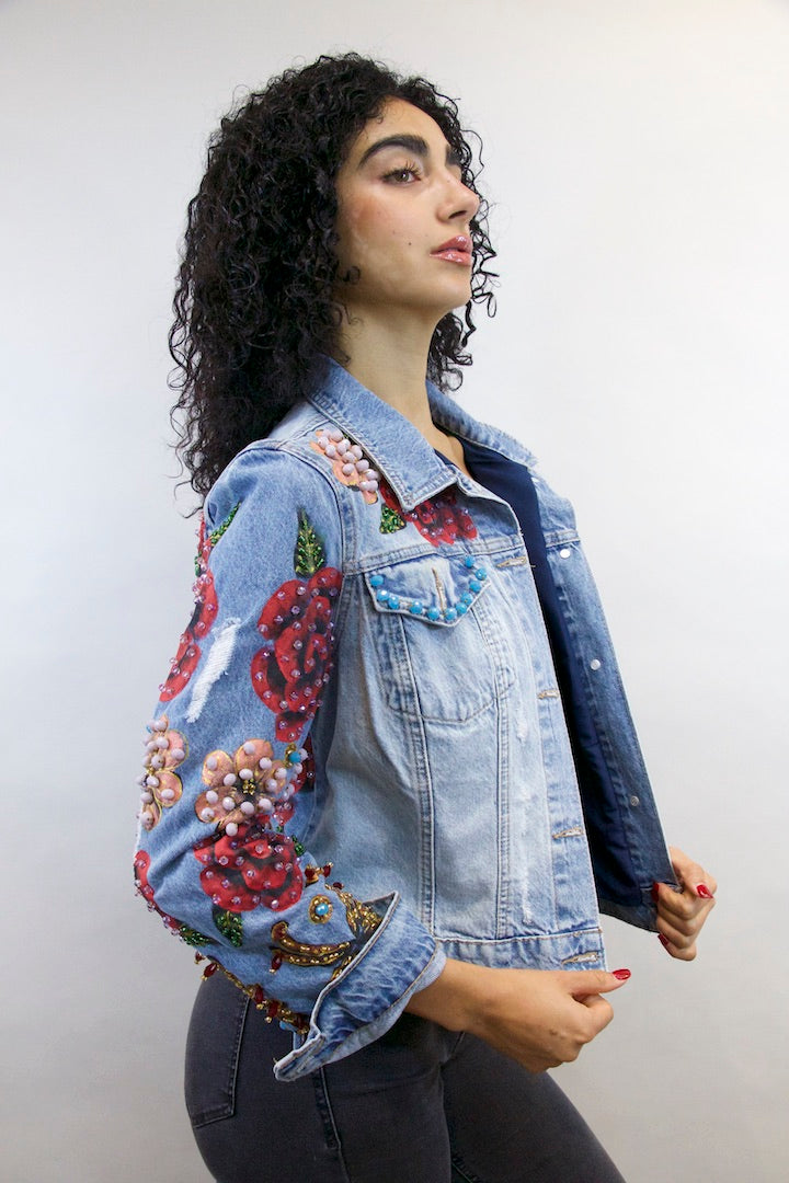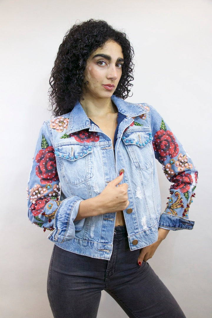 CHAMARRA PINTADA Y BORDADA A MANO CON PUROS CRISTALES.