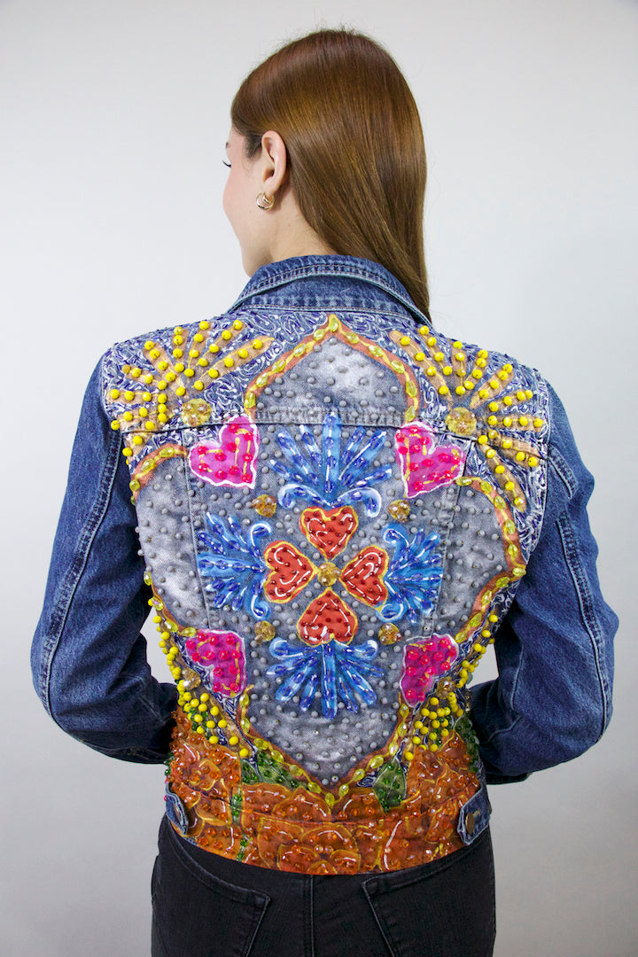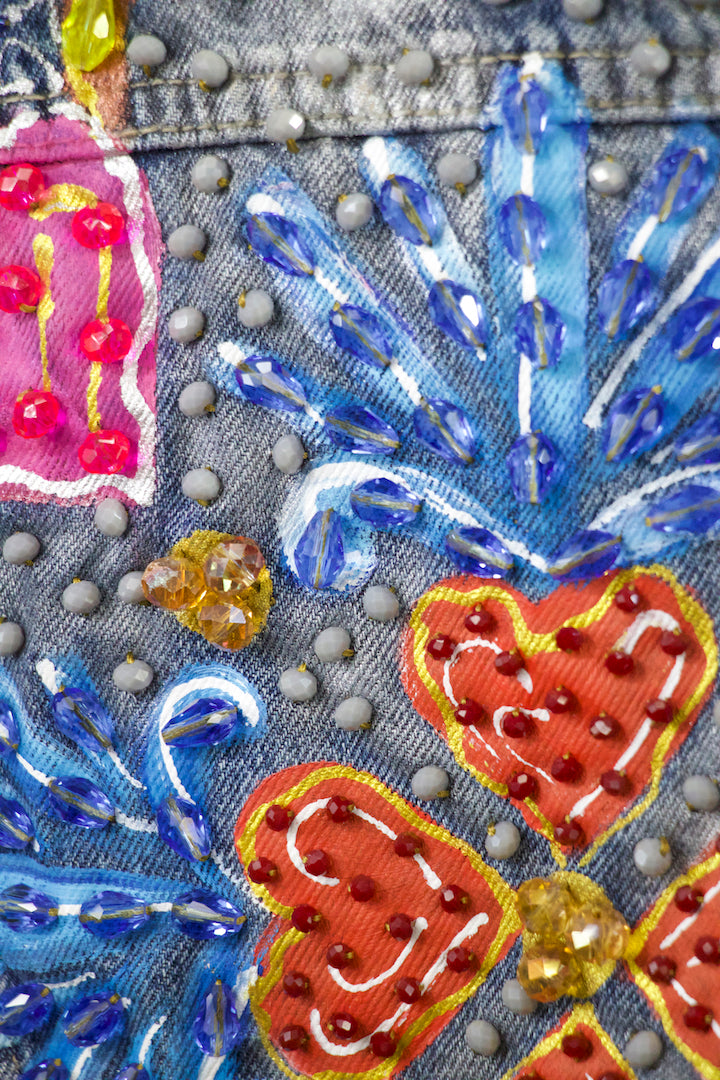 CHAMARRA PINTADA Y BORDADA A MANO CON PUROS CRISTALES.